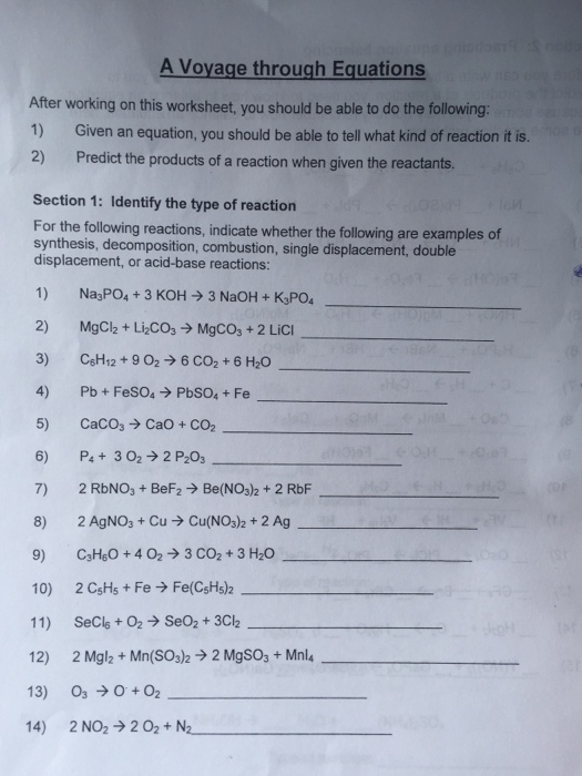 A Voyage through Equations. After working on this worksheet you should be able to do the following. Identify the type of reaction For the.