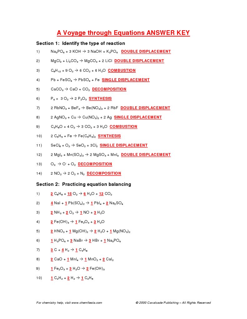 A Voyage Through Equations with answers Reaction Types and Balancing Practice. View KEY-A-Voyage-Through-Equations-answer-key from CHEM 567 at Waltrip H S. A Voyage through Equations ANSWER KEY.